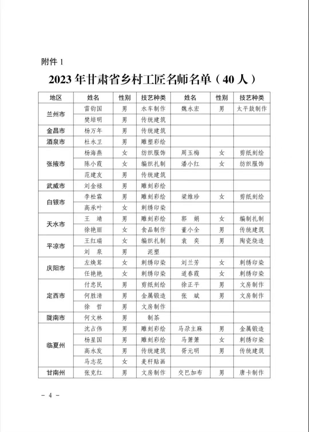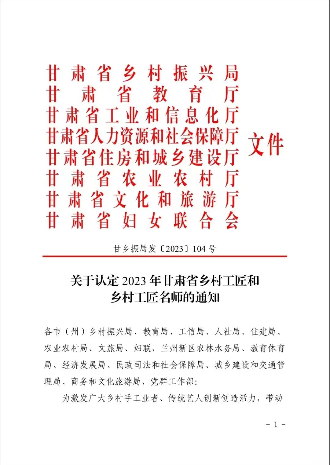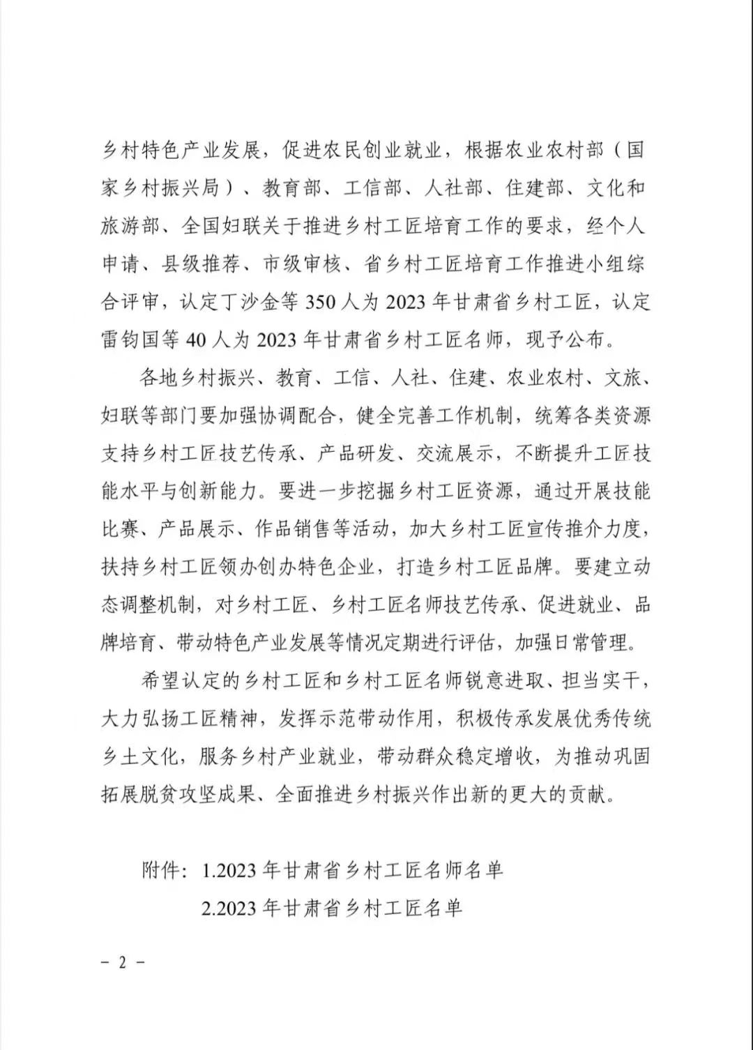 2023年甘肅省鄉(xiāng)村工匠名師和鄉(xiāng)村工匠,經(jīng)省鄉(xiāng)村工匠培育工作推進小組綜合評審,甘肅省鄉(xiāng)振局、省教育廳、省工信廳、省人社廳、省住建廳、省農(nóng)業(yè)農(nóng)村廳、省文旅廳、省婦聯(lián)聯(lián)合發(fā)文(甘鄉(xiāng)振局發(fā)[2023]104號)認定,于近期公布。
