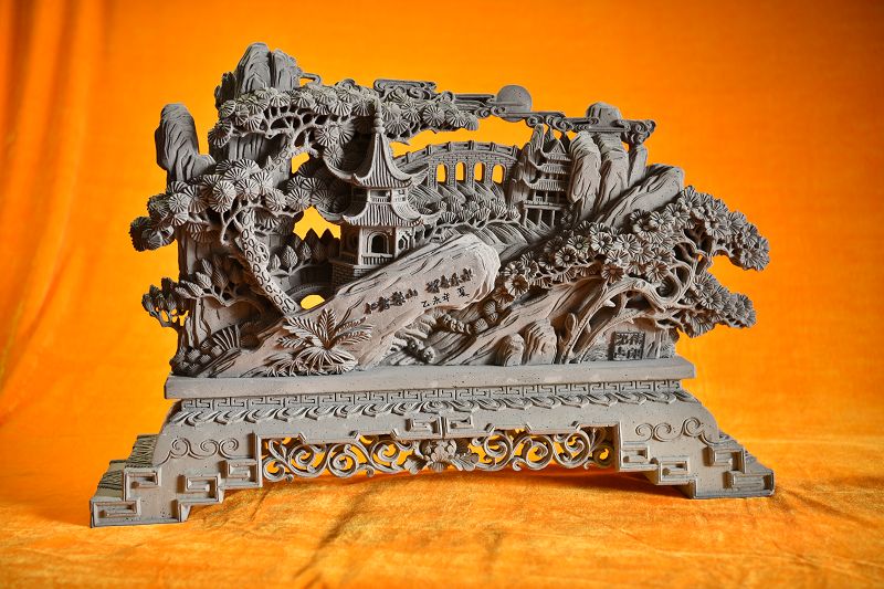 作品高400mm、寬581mm、厚120mm,重10.4kg,作品材質(zhì)為傳統(tǒng)手工青磚,采用臨夏磚雕的深浮雕、鏤空雕、圓雕等技藝工法,于2015年完工。作品雕法神妙,技藝純青,得心應(yīng)手,巧奪天工,古樸典雅。